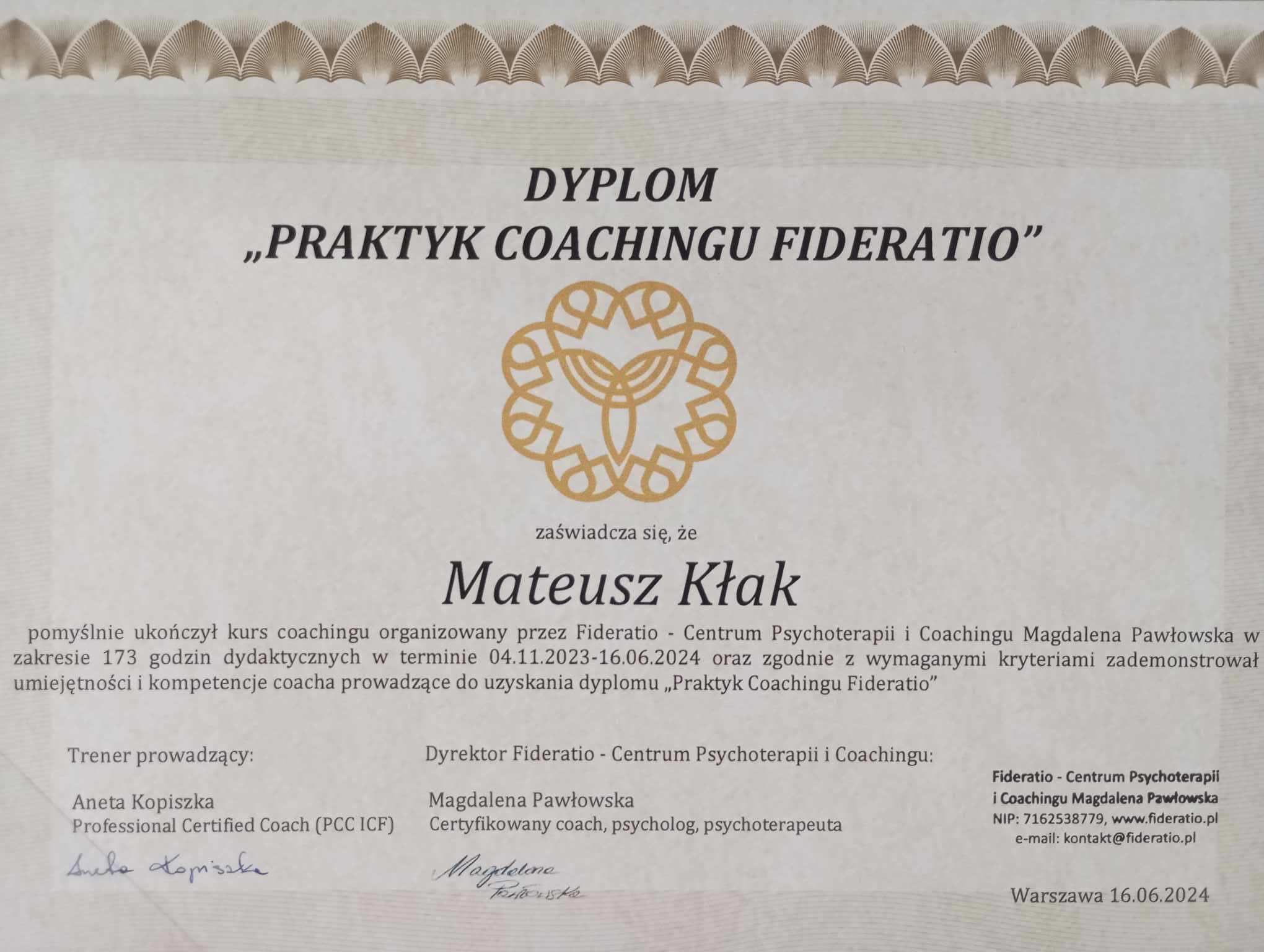 • Ukończyłem Kurs Praktyka Coachingu w Centrum Psychoterapii i Coachingu Fideratio,