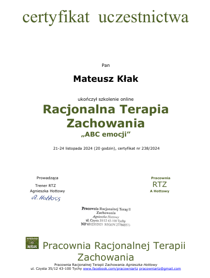 • Ukończyłem szkolenie z Racjonalnej Terapii Zachowania "ABC emocji" prowadzone przez Agnieszkę Hottowy (Pracownia RTZ), aby zdobyć wiedzę na temat wpływu myśli i przekonań na nasze życie oraz sposobów, w jakie możemy z nimi skutecznie pracować.