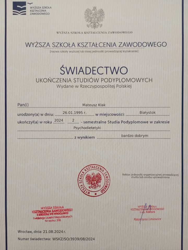 • Dlatego też ukończyłem studia podyplomowe na kierunku Psychodietetyka, aby lepiej zrozumieć perspektywę