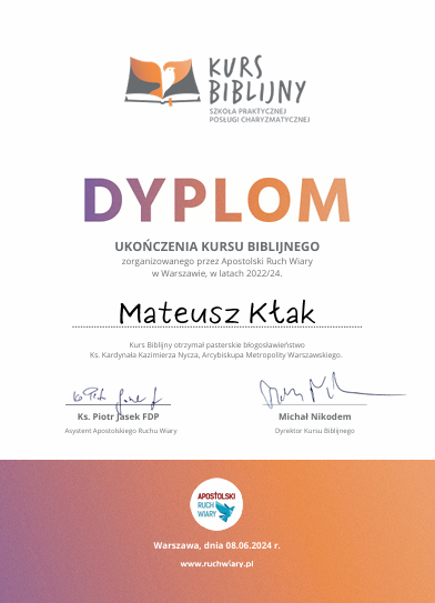 • Jestem także absolwentem dwuletniego Kursu Biblijnego organizowanego przez Apostolski Ruch Wiary. Pozwolił mi on lepiej poznać Pismo Święte i Boże obietnice dla naszego życia. A są to obietnice: